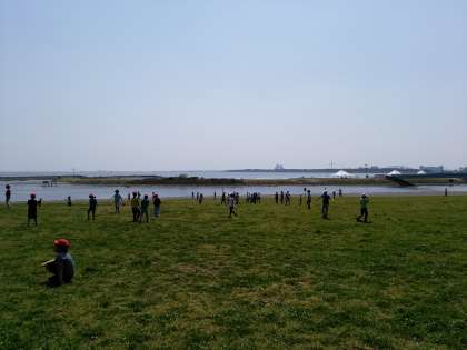 海の見える原っぱで班ごとに遊んでいます。鬼ごっこやだるまさんがころんだをしています。