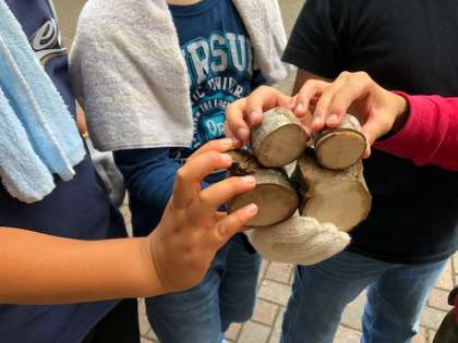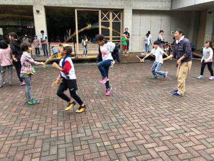 里山体験で切った木は、宝物のようです。長く編んだ縄で、本当の縄跳びをしています。