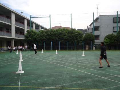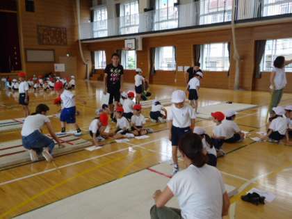 校庭ではソフトボール投げ、体育館では長座体前屈や立ち幅跳びなどを行いました。(副校長)