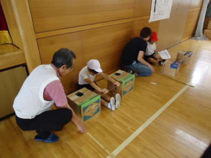 1,2年生のスポーツテストを行いました。毎年、地域の方や保護者の方に手伝いをお願いしています。