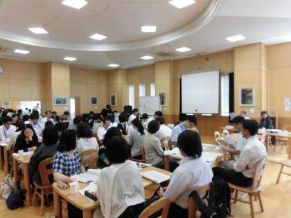 写真は、本校での授業公開の様子と、全体協議会の様子です。