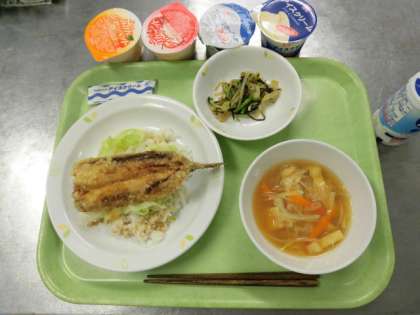 今日は7月20日の土用の丑の日にちなんで、うなぎのかわりにいわしのかば焼き丼をとりいれました。甘辛のたれがかかった味付けはこどもたちから人気です。また、2学期最後の給食ということで、事前に選ぶセレクトデザートです。こどもたちが選んだデザートは・・・多かった順に、みかんシャーベット、バニラアイスクリーム、りんごシャーベット、フローズンヨーグルトでした。長い夏休み元気に過ごしてほしいと思います。そして、2学期の給食も楽しみにしてください。