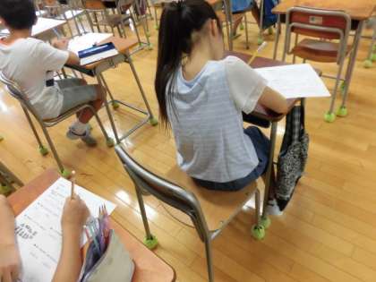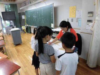 1学期の算数の復習プリントに取り組み、先生に見てもらいます。