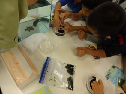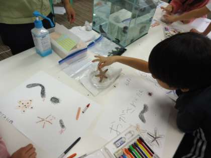 目の前にいるナマコ、ウニ、ヒトデを観察して、スケッチをしました。また実際に触る事ができ、貴重な経験をする事ができました。目を輝かせながら、たくさんの新しい発見をしました。(2年担任)