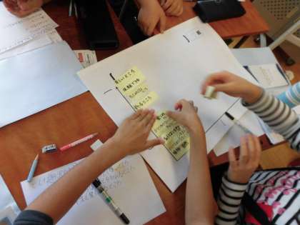 「行ってみたくなるところ」「体験できるところ」「あきないところ」「楽しいところ」「体験できるところ」など、優先順位を付箋を使って、真剣に考えていました。