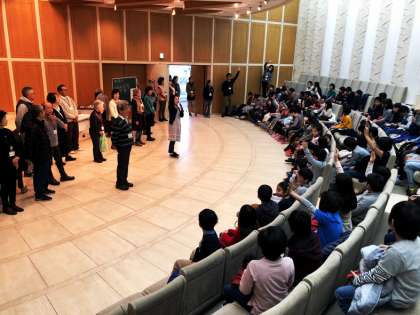 上段:講堂で学芸員から鑑賞マナーなどのお話