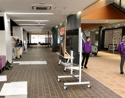 3月17日(日)に、駒澤大学にて「みんなの発表会 in 駒沢 2018」というイベントが開催されます。駒沢小学校も図工作品の展示で参加しています。昨日、手話サークルの学生、学生部の職員のみなさんにご協力いただき展示してきました。児童作品約150点のほか、本校の展覧会「●▲■、おもいのかたちーみえないものをみるー」で好評だった6年生のつくった顔出しパネル「名画の中にはいってみたら」も設置しています(この顔出しパネル、軽くて大きいのですが、大学公用車に乗らないということで、大学職員のみなさんが駒沢小から大学まで歩いて運んでくださいました!)。お時間のある方は、当日ぜひ会場に足を運んでください。(図工専科)