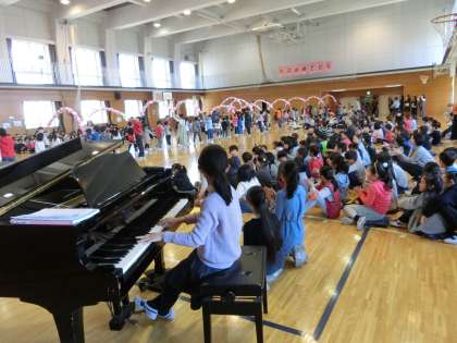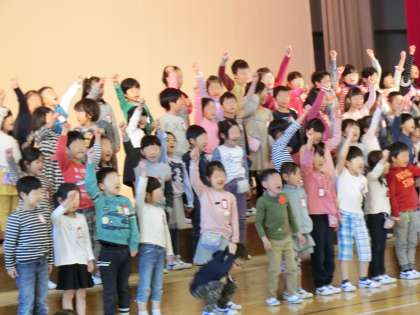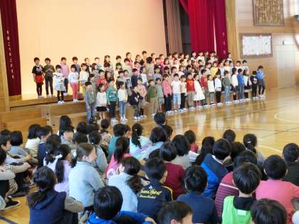 1年生がお礼の言葉と歌を元気いっぱいに披露しました。入学して6日間。とても立派です。その後、全校で力強く「勇気100%」の歌を歌いました。みんなの明るい歌声が体育館に響き渡りました。会が終わると1年生が、全校の拍手を受けながら退場しました。1年生を迎える会を企画・運営した運営委員会の子供たちもとても立派でした。みんなで創り上げた、とてもあたたかな「1年生を迎える会」になりました。