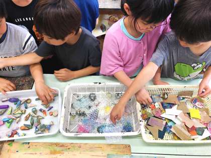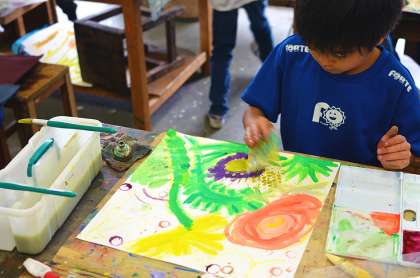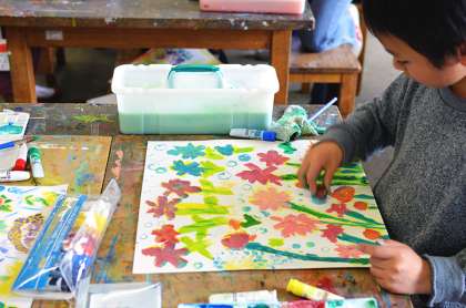 3年生、「お花がいっぱい」の授業から。先週から絵の具を使って色で描いています。今週は段ボールの断面、キャップ類、凹凸のある緩衝材、木片など身近にあるさまざまな素材を用意しておきました。これらの素材に絵の具をつけて版として使うためです。絵の具での表現が決して“色塗り”ではないことは、4月19日の「図工室より」で触れましたが、自分の色で表現するための方法は筆だけではありません。異なる版素材を重ねたり、版そのものを擦りつけたり、リズミカルに叩きつけてみたり…、どう使うかは子どもたちの自由です。筆では表せない、偶然できるおもしろさも取り入れながら自分らしい花を描いていきます。もちろん版を使わないという選択肢もありです。(図工専科)