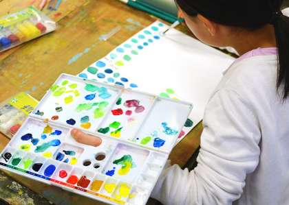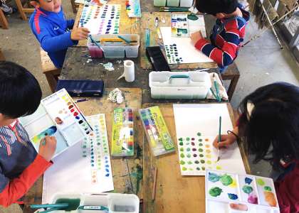 授業の最中、「ぼくの好きなみどりはこれだ」「え?そうなの、ぼくはこっち」。そんな会話が聞こえてきました。これまで子どもたちの共通言語であった“みどり”は、この日、ひとりひとりの経験や感性にもとづく、特別な色として刻まれたことと思います。(図工専科)