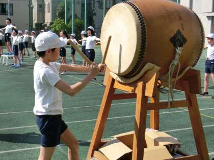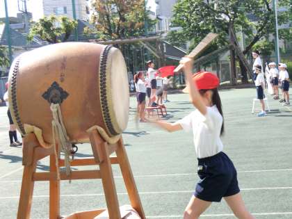 応援団の様子です。両チームの子どもがたたく和太鼓が校庭に鳴り響きます。
