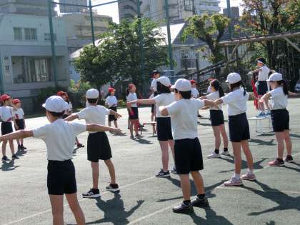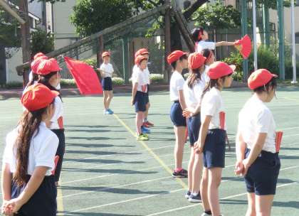 応援団の様子です。大きく元気な声で応援の練習を毎日行っています。みんなで気持ちを一つにして運動会の応援を盛り上げます。これから練習をたくさん積み重ね、運動会では大いに力を発揮してくれることでしょう。応援団の活躍を期待しています。