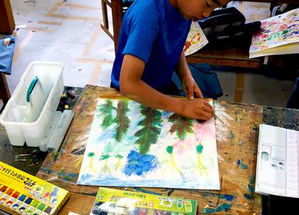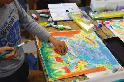 先週の木曜日の3年生、「お花がいっぱい」の授業。前回(「4月26日 図工室より」を参照)の版素材に加え、今回はソフトパステルを用意しました。指を使ってぼかしたり、色を重ねて擦り込んだり、角をつかって線で描いたり…。水彩絵の具、さまざまな版素材、ソフトパステル。子どもたちが自分で使いたい描画材を選び、納得いくまで描きます。この日、最終回のつもりでしたが、終わっていない子どももいるので、次回もう一回、時間をとります。(図工専科)
