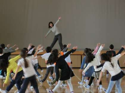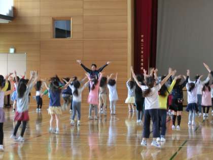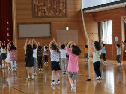 1年生の様子です。5月14日は雨のため校庭で練習ができませんでした。体育館で練習をしました。1年生の子どもが元気にはつらつと表現を楽しんでいる様子が後ろ姿からもよくわかります。