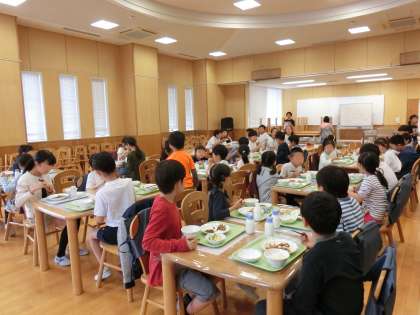 今日はお誕生日給食でした。42名の4月生まれの子どもたちと、給食委員会の子どもたちがランチルームで給食を食べました。1年生は初めての場所で少し緊張しているようでしたが、じゃんけんゲームなどをして楽しい時間を過ごしました。給食委員の子どもたちのアイディアもたくさん生かされていました。じゃんけんゲームもその一つです。