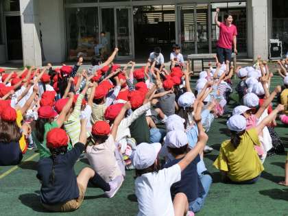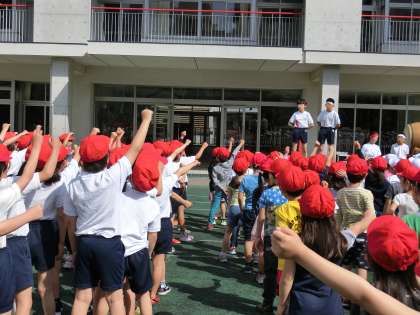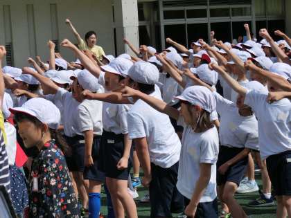 5月16日、音楽朝会の時間を活用して、運動会の歌の練習が行われました。応援団が音頭をとりました。開会式に歌う予定です。毎年、大きな盛り上がりを見せる歌「ゴーゴーゴー」。合間に入れる「ゴー」のかけ声に合わせて、こぶしを高らかにあげます。先生からもっと力強く、もっと空高く響き渡るようにというアドバイスを受け、子供たちの意気込みはますます高まりました。大きな声も出ています。運動会当時の子供たちの元気な歌声を楽しみにしていただければと思います。