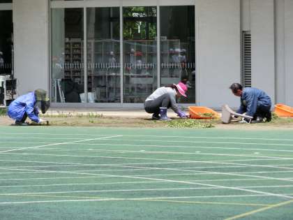 5月も中旬に入り、日中の気温も高くなってきました。運動会の練習ではこまめな水分補給に心がけています。健康管理にしっかり気を付けながら、練習をがんばっていきたいと思います。子どもたちが運動会の練習に真剣に取り組んでいる傍らで、学校主事が校庭の環境整備を行っていました。