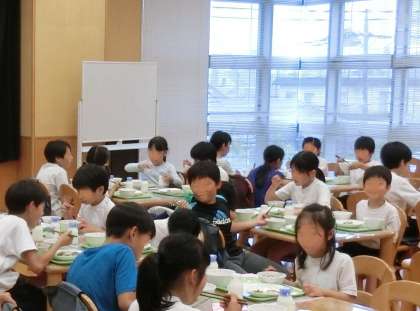 5月生まれの子どもたちが集まって「お誕生日給食」がランチルームで行われました。給食委員の5・6年生がクイズを計画して準備を進めていました。お誕生日給食の日は、ゼリーがケーキをセレクトすることができます。今日はケーキをセレクトした子が多かったそうです。5月生まれのみなさん、お誕生日おめでとう。