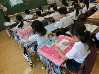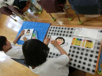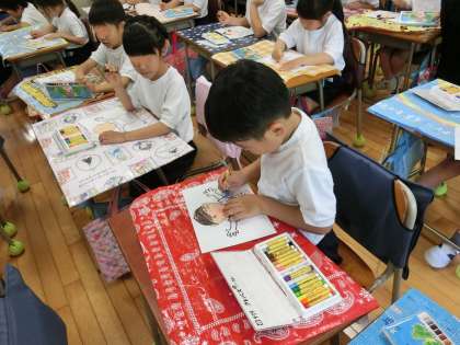 1年生の図工の時間の様子です。「お誕生日列車用の自分の絵を描こう」が今日のテーマです。活動の流れを先生と確認して、取り組み始めた子どもたち。姿勢よく、集中して自分の絵を描きはじめました。クレパスの塗り方もみんな上手です。色も工夫しています。日焼けしている肌の色をどうしたら表現できるか悩んでいる子もいました。色を混ぜながら、すてきな作品が次々でき上がっていきました。