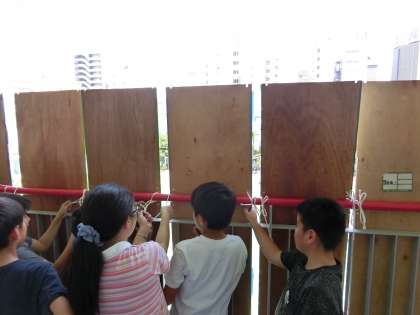 放送担当の子どもたちは原稿を読む練習を熱心にしていました。スローガンやプログラム、得点板も子どもたちの協力のもと取り付けられました。