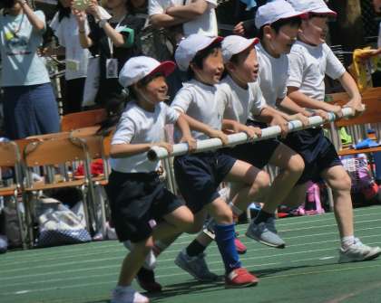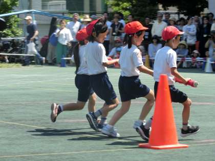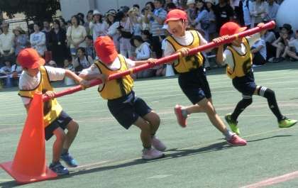 仲間と力を合わせて、棒を手に走ります。速く上手に走るための作戦を何度も話し合いました。最初はうまくできなかったコーンを回るスピードも練習ごとに速くなり、子どもたちの吸収力と判断力の大きさを感じました。
