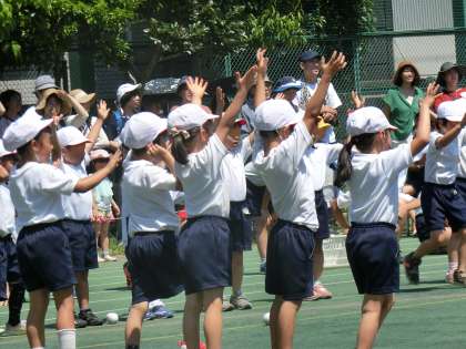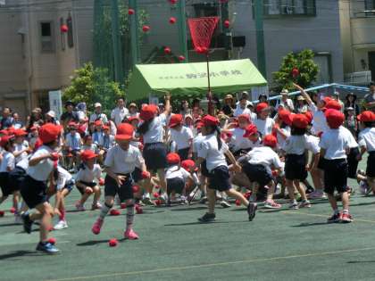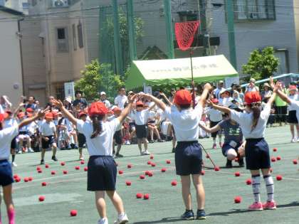 子どもたちのかわいいチェッコリダンス。音楽に合わせてポーズをとりながら踊ります。音楽が止まると、玉入れ開始。再びチェッコリダンスを踊り続けるかわいいかわいい1年生に大きな拍手と声援をいただきました。1年生の一生懸命さとかわいらしさでいっぱいの競技になりました。