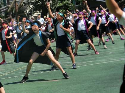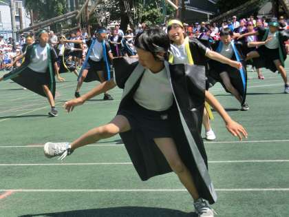 静と動、高さと低さを巧みに表現して、「ソーラン節〜この一瞬を本気に」の世界を観客に伝える5・6年生。本気の姿勢を大切にしながら練習の成果を発揮します。