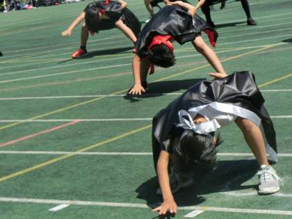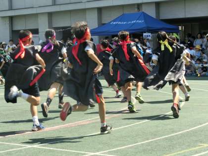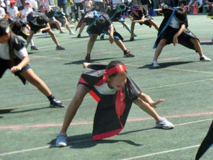 5年生は力強い表現で「ソーラン節〜この一瞬を本気に〜」に挑戦しました。入場にも、かけ声にも、指先までにも本気の心意気を込めています。構えのポーズがきまります。波を表現しながら、猟師の力強さ自然の厳しさを体いっぱいに伝えます。
