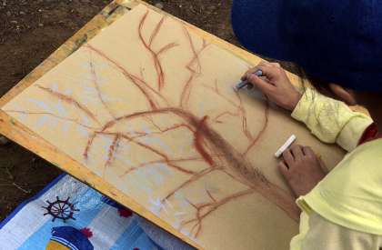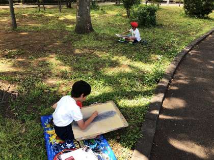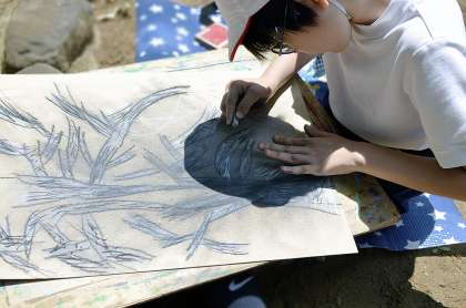 4年生「木々との対話」。5月17日は、選んだ木を黄ボール紙にコンテで描きました。先週は運動会の前日だったので図工はお休みしました。明日(31日)、もう一度緑泉公園に行きます。(図工専科)