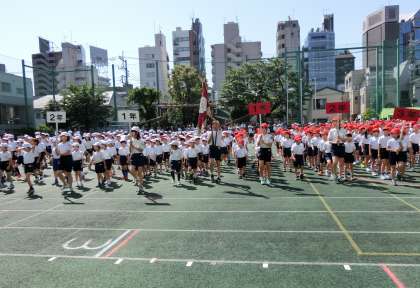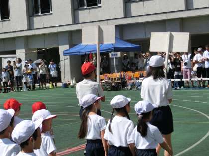 令和元年度運動会がはじまりました。最初に校旗・運動会旗を持った応援団が入場します。この校旗・運動会旗はとても重たく姿勢を保つのが大変です。でも、さすが6年生。堂々としています。応援団に続き、プラカード係を先頭に各学年の子供たちが堂々と行進してきました。