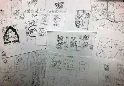 さて、そうやってできあがったポスターはというと…。家族が地域でゴミ拾いの活動をしている姿や、上級生がこっそりペットボトルのキャップを投げて遊んでいる場面から着想を得たもの、漫画のコマ割りを使い、つい読みたくなる仕掛けを施したものまで、子どもたちの気づきや経験がきっかけとなり生まれたポスターがたくさんできました。