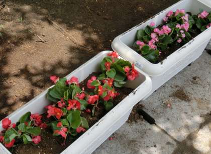 赤と白と2種類のピンクのベゴニアを植えました。1つのプランターに5株、同色の花になるように・・・という植え方の約束がありました。自分のグループで担当する花の色を確認しながら、上手に植えることができました。この花たちは、大蔵運動公園や馬事公苑、その周辺近隣駅などに飾られ、訪れる方を世田谷区らしい華やかな雰囲気でお迎えするそうです。花の引き取りがある6月末までは学校でお世話をする予定です。