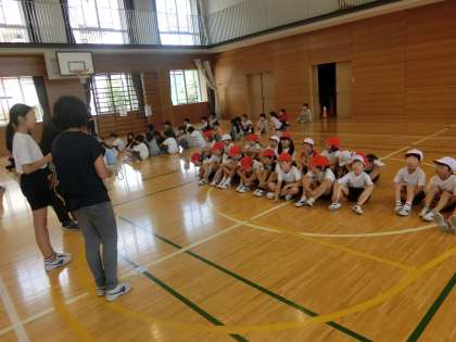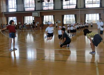 運動委員会の5・6年生が1・2年生の縄まわしを手伝いました。高学年として低学年をいつも支えてくれる5・6年生の子どもたちです。1・2年生が跳びやすいように、速く回したり、ゆっくりふわっと回したりと、タイミングを合わせてくれました。おかけで、低学年の子どもたちも楽しくなわとびの練習ができました。1・2年生は練習の最後にしっかりお礼の言葉を伝えることができました。