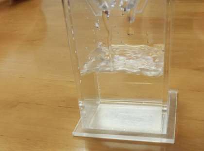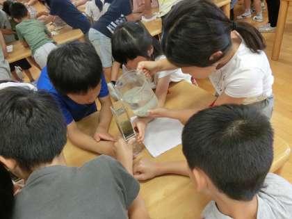 ろ過したあとの水が透明できれいになっていることにみんな驚いていました。実験を通して、おいしい水道水が届くまでの工程を学びました。友達と協力して実験に取り組む4年生の真剣さが伝わってきました。