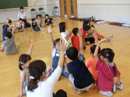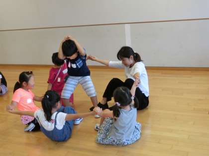 次は、グループで話し合いながら「花」を表現しました。雄しべや雌しべの様子を体の動きで伝えるグループもありました。子どもたちのアイディアに感心するばかりでした。