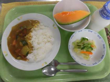 今日は夏野菜をたくさん使ったカレーライスでした。なすやかぼちゃ、ズッキーニは油で揚げてから最後に煮込みました。いつもよりスパイスが効いていましたが、よく食べていました。メロンはもう少し熟れていて欲しかったと思いましたが、子どもたちからは人気で、残ったメロンのお代わりじゃんけんで盛り上がっていました。