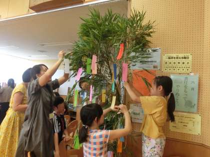 明日の七夕の日にちなんで、子どもたちは願いごとを短冊に書きました。笹の葉に願いごとを結び付ける子どもたち。いっぱいの夢であふれました。工作も楽しみました。