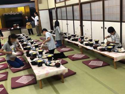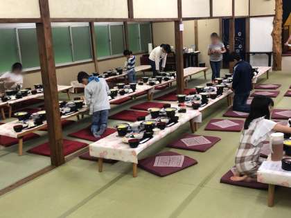 朝食の様子です。食事係が先に来て準備を進めます。よくがんばっています。