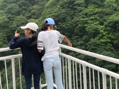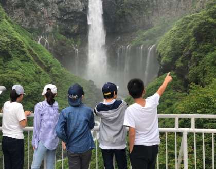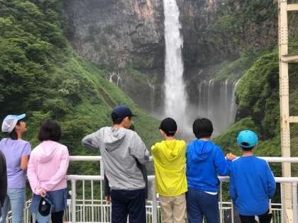 華厳の滝に着きました。日光の有名な滝の一つです。100メートル降りて滝を見学しました。ひんやりとした空気。鮮やかな緑。そして、雄大な滝を背景に集合写真を撮りました。