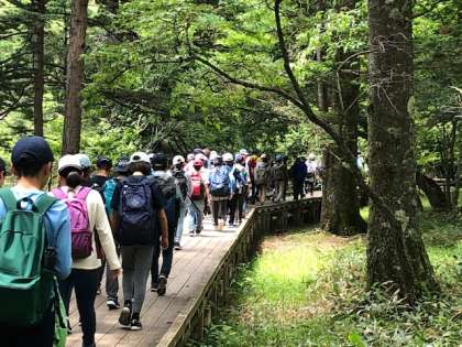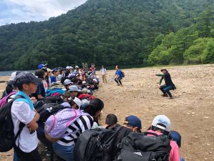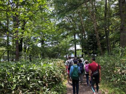 湯元源泉を後にして、次は湖畔に向かいました。湖畔で学年集合写真を撮りました。その後、ハイキングスタート。自然を感じながら歩きました。