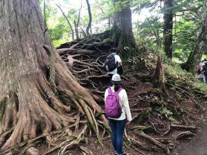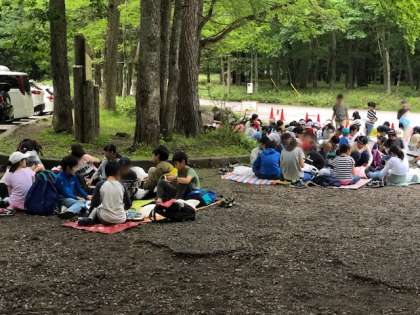 ハイキングの途中、大きな根っこに驚いたり、キノコを見つけたり、湖の水の透明度に感心したりと自然を楽しみました。途中、湯滝で昼食をとりました。ところが.....お弁当を食べ終わったころ、強い雨が急に降りはじめました。急きょ、バスをまわしてもらうことにしました。雨具をつけ、バスを待ちました。