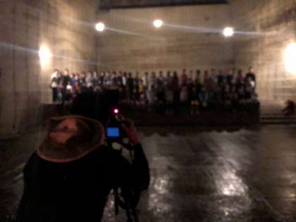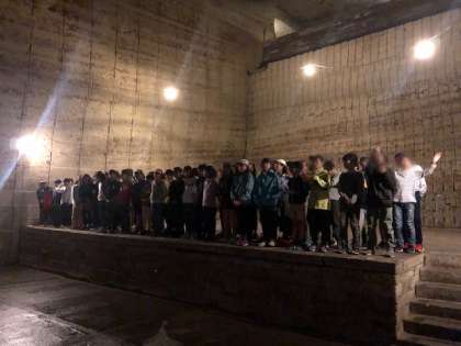 大谷資料館に着きました。青空と真っ白い雲が広がる中、自然の雄大さが飛び込んできました。「未知なる空間」と呼ばれる大谷石地下採掘場跡に入ると一気に気温が下がります。この空間で子どもたちは練習を重ねてきた「にじ」を立派に歌い上げました。感動しました。子どもたちの心が一つになった瞬間です。子どもたちだけで集合写真を撮りました。思い出の1枚です。