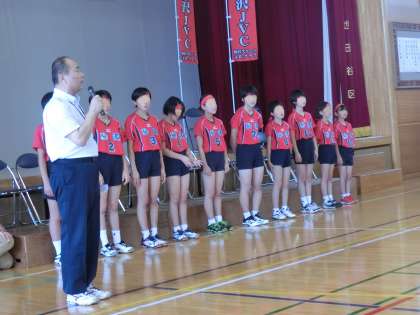 こまざわスポーツ・文化クラブに所属する「駒沢JVC女子」バレーボールチームが都大会で優勝し、全国大会に出場することになりました。全国大会は8月6日に行われます。7月27日、全国大会出場に向けて、壮行会が駒沢小学校体育館で行われました。こまざわスポーツ・文化クラブ会長、駒沢JVC女子チームの監督、保坂区長から激励の言葉が寄せられました。本校からも選手として出場しており、うれしい限りです。