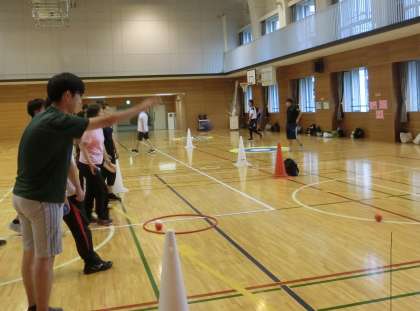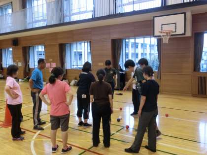 後半は、体育館で実際にボッチャの競技に挑戦しました。投げ方のこつをつかむと、楽しさが大きく広がります。学校対抗で試合も行いました。先生たちも一喜一憂しながらボッチャを心から楽しんでいました。2学期以降、子どもたちへの指導に生かしていきたいと考えています。