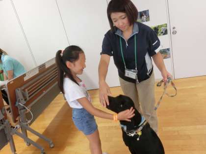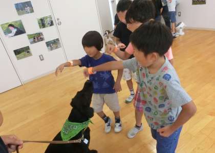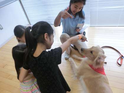 犬のトレーニングにも挑戦。マテやおすわりなど、声と動作で合図を送ると、上手に指示に従うワンちゃんたち。トレーニングの楽しさを味わうとともに、ワンちゃんたちの賢さに感心していました。