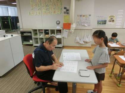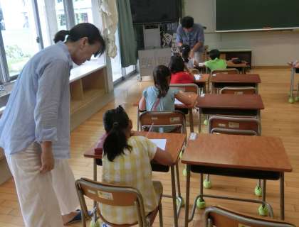 8月28日、午前9時から10時までの1時間、夏の勉強会が行われました。この勉強会では、特に算数を中心に1学期の復習をしたり、繰り返しの計算問題を解いたりします。たくさんの子どもたちが熱心に算数の学習に取り組みました。教員も子どもたちの指導にていねいに向き合っています。学校支援の地域の皆さんも協力してくださっています。