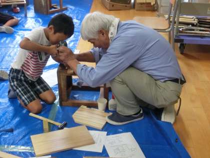 サマースクール2日目を迎えました。毎年大人気の木工作教室が開催されました。この教室では、東京土建・世田谷支部の皆様のご協力をいただきました。たくさんの方々が子供たちの工作を支援してくださいました。子どもたちも工具を上手に使いこなしながら、安心して作品作りに臨めたようです。どの子も真剣なまなざしです。