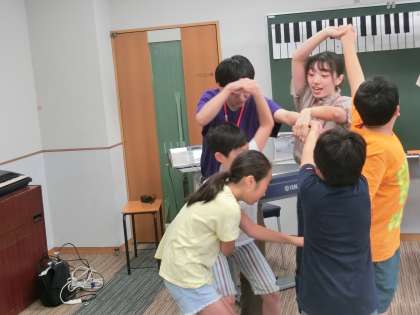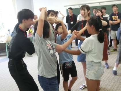 8月28日、サマースクール3日目。今日は、駒澤大学経営学部の大学生の皆様にご協力いただきました。たくさんのお兄さん、お姉さんが学校にきてくださり、大学のゼミごとに子どもたち向けの講座を開催してくださったのです。楽しいゲームをしながら社会人として必要なこと、経済の仕組みなどを学ぶことができました。ここに紹介した3枚の写真は、「協働」の大切さを学ぶ講座です。「経営マスターになるために旅に出たみんな。途中で相棒のピカチュウがロケット団にさらわれてしまった! ピカチュウを救うためには・・・」楽しい想定の中、子どもたちの活動が行われました。「協働」の大切を感じるゲームに挑戦しました。