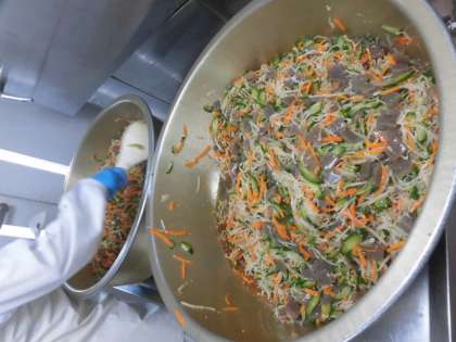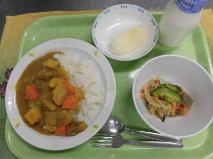 今日から2学期の給食が始まりました。初日は食べやすいポークカレーライスです。9月は気温や湿度も高いので、いつもよりはカレー粉の量を増やしやや辛口でした。人気のこんにゃくサラダはどのクラスもほとんど残菜がありませんでした。果物の「なし」は今が旬の豊水です。とてもみずみずしく甘さも十分でおいしくいただきました。