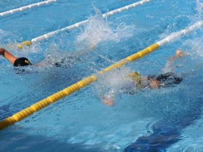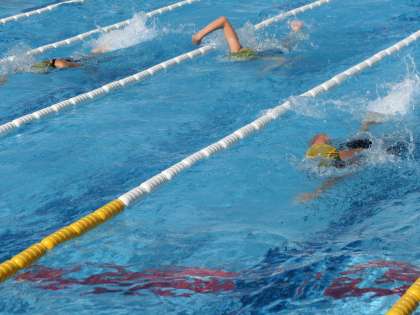 一生懸命に泳ぐ子どもたち。自分の力への挑戦です。ゴールの瞬間の子どもたちは皆、肩で息をしています。全力で取り組んでいることをうれしく見守りました。